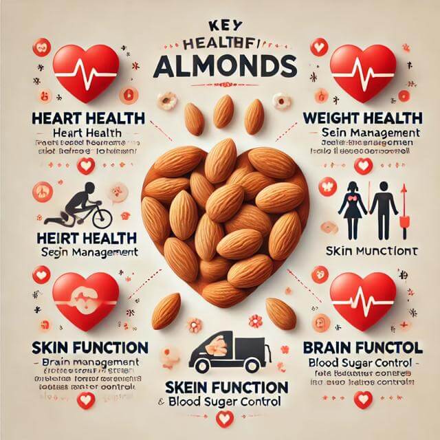 1. 심장 건강 개선: 아몬드는 불포화지방산이 풍부하여, 나쁜 콜레스테롤(LDL)을 감소시키고 좋은 콜레스테롤(HDL)을 증가시켜 심혈관 건강에 도움을 줍니다.