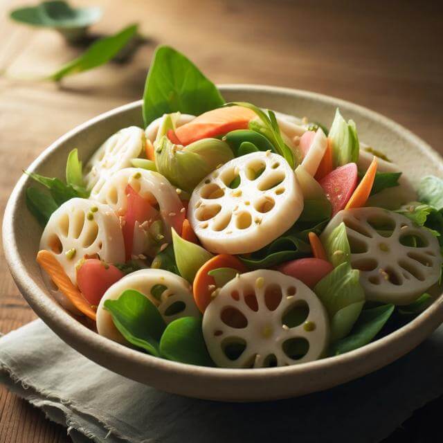 1. 연근 샐러드: 얇게 썬 연근을 살짝 데쳐 각종 채소와 함께 드레싱에 버무려 샐러드로 섭취하면 상큼한 맛과 건강을 동시에 챙길 수 있습니다. 식감이 아삭아삭하고 맛이 담백해 누구나 즐길 수 있습니다.